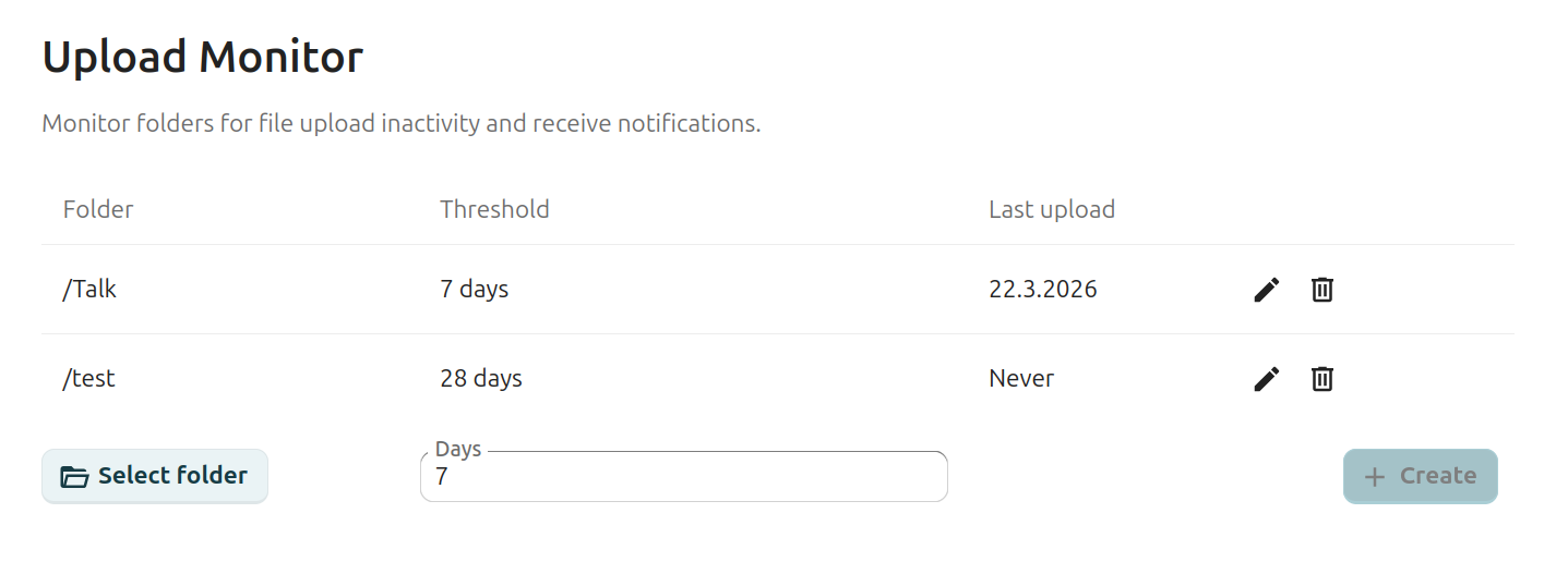 Monitor folders for file upload inactivity and receive notifications when no new files have been uploaded within a configured time period.